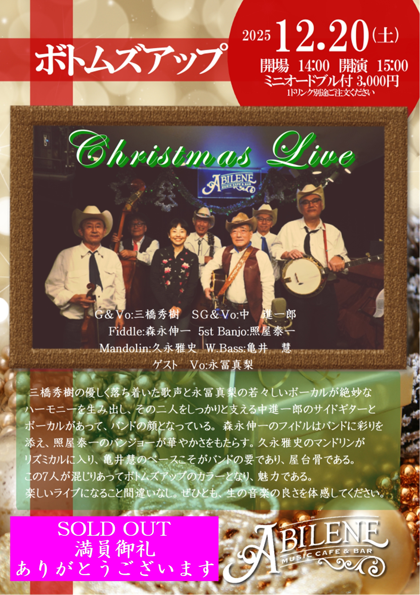 ボトムズアップ 三橋秀樹の優しく落ち着いた歌声と永冨真梨の若々しいボーカルが絶妙なハーモニーを生み出し、その二人をしっかりと支える中 進一郎のサイドギターとボーカルがあって、バンドの顔となっている。 森永伸一のフィドルはバンドに彩りを添え、照屋泰一のバンジョーが華やかさをもたらす。久永雅史のマンドリンがリズミカルに入り、亀井 慧のベースこそがバンドの要であり、屋台骨である。 この7人が混じりあってボトムズアップのカラーとなり、魅力である。楽しいライブになること間違いなし。ぜひとも、生の音楽の良さを体感してください。